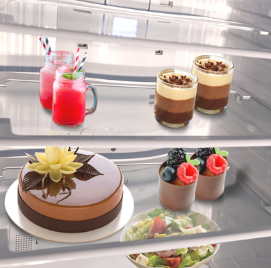 در قسمت یخچال این یخچال فریزر ۲۷ فوت الکترواستیل ۴ طبقه موجود است که به وسیله طبقات شیشه ای نشکن که قابلیت جابجایی ارتفاع دارند تقسیم بندی شده است. در قسمت درب یخچال نیز ۳ شلف تعبیه شده است. همچنین در قسمت فریزر که پایین این مدل قرار دارد ۴ کشوی بزرگ و ۱ کشوی کوچک و یک یخساز دستی تعبیه شده است.